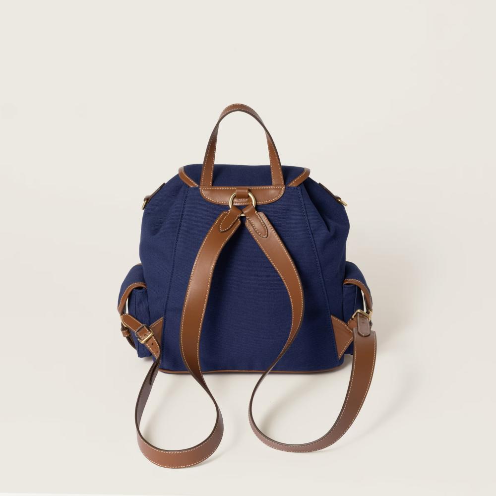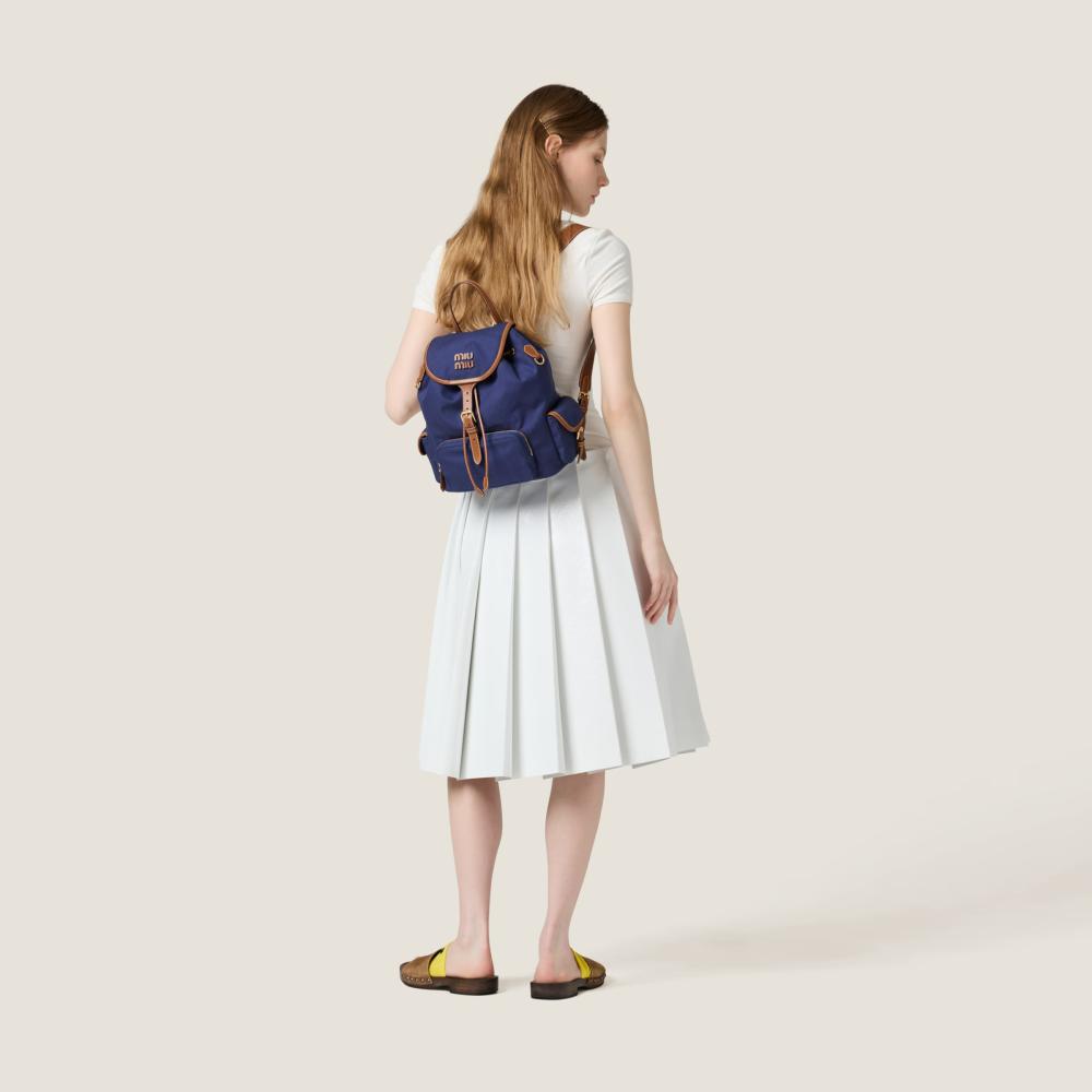 تجمع حقيبة الظهر الكانفا والجلد المستوحاة من الأدوات المدرسية بين الطابع الحرفي والتفاصيل الكاجوال. يعكس التصميم متعدد الجيوب وإمكانية ارتدائه كحقيبة كروس بودي الروح العصرية والمرحة لحقائب ميو ميو.