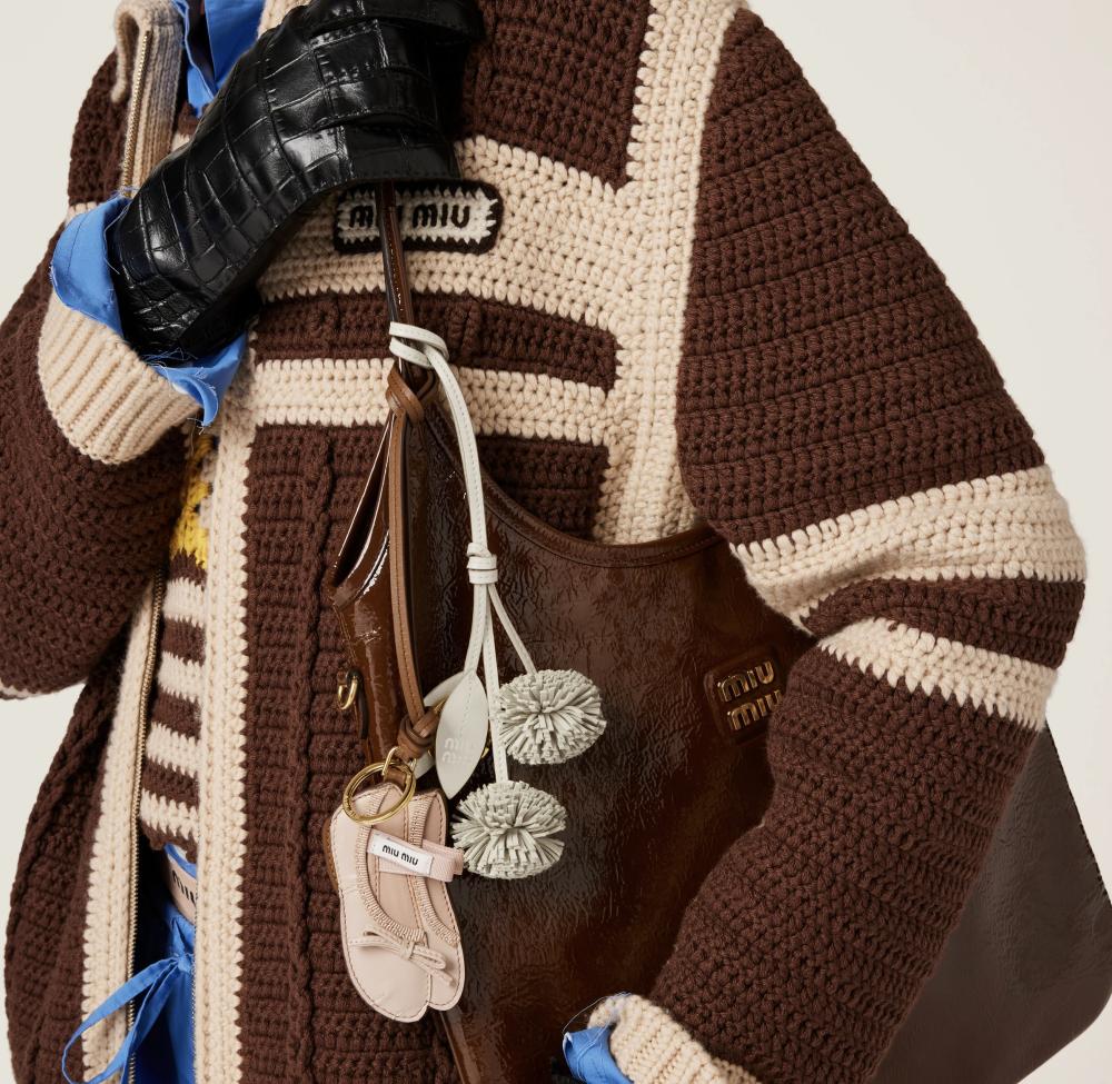 تتحول العناصر المميزة لتشكيلة ميو ميو إلى أكسسوارات فاخرة للحقائب، تضفي توليفة بطابع مرح وشخصي. حلية سلسلة مفاتيح من الجلد تستلهم حذاء Miu Ballet وتضفي لمسة مميزة على تصميم الحقيبة.