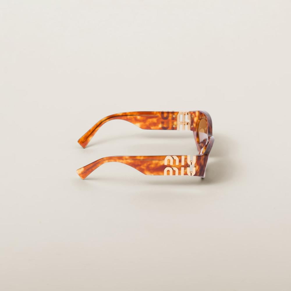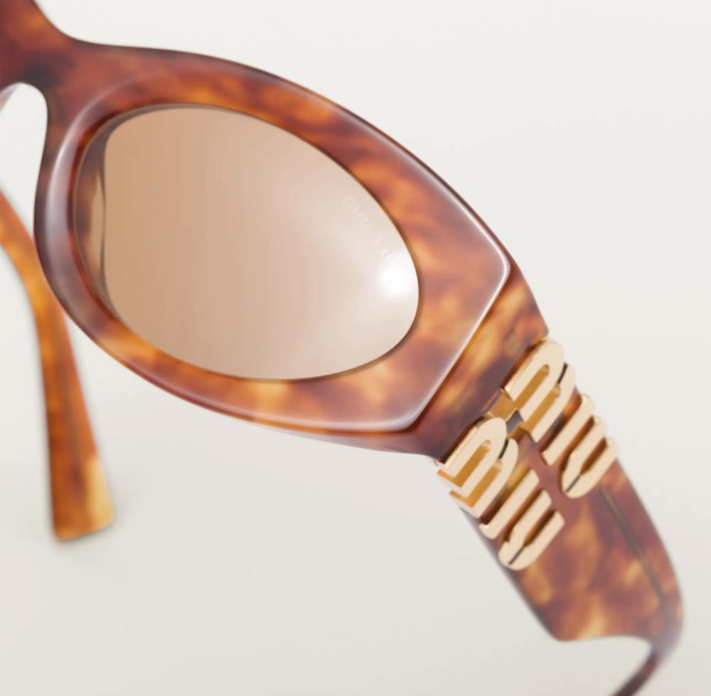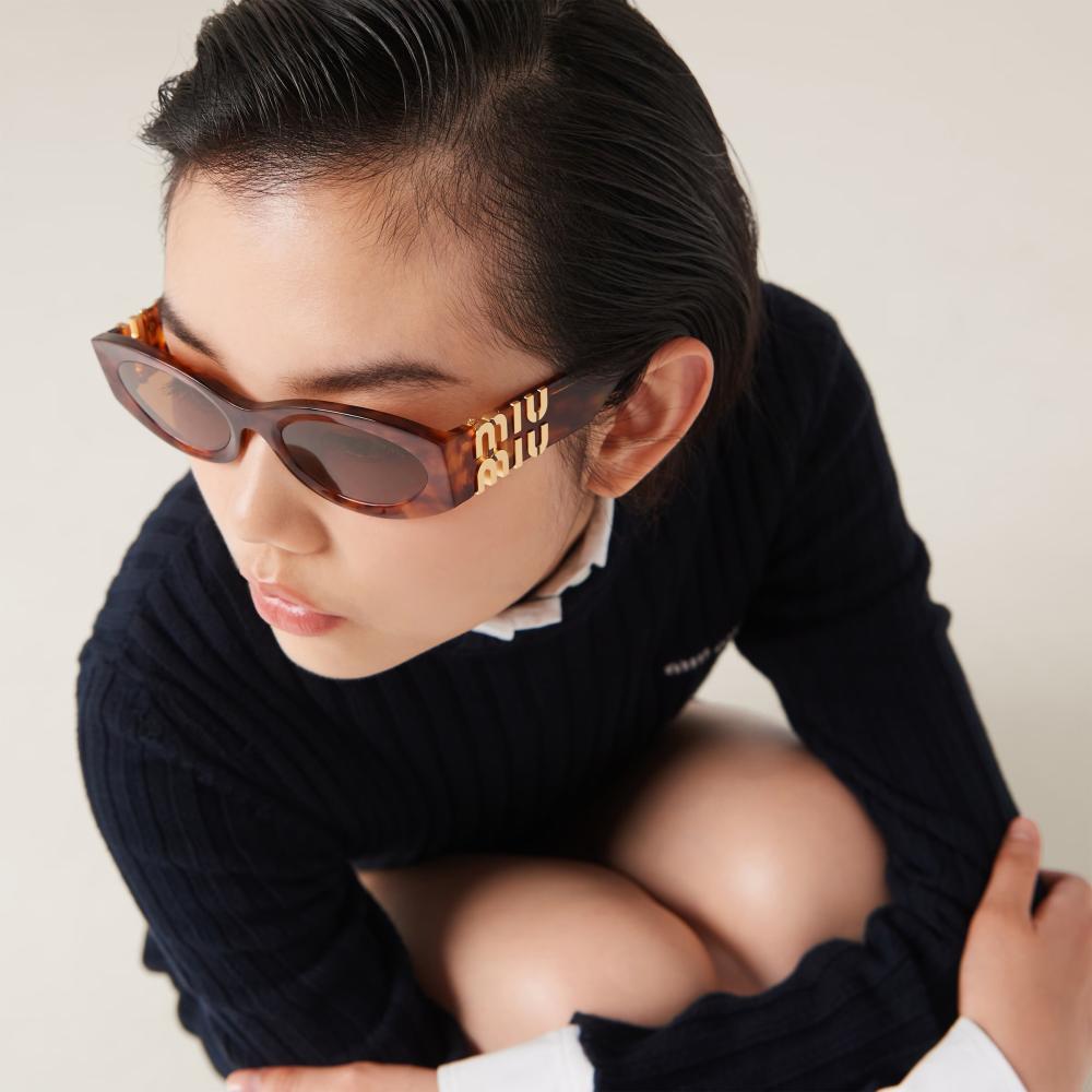 تجسد هذه النظارات الشمسية الأسيتات البيضاوية الأنوثة الجريئة والمتطورة. تتميز واجهة الإطار المنخفضة بشعار مياو مياو العمودي الجديد المدمج في مفصل المعابد السميكة.